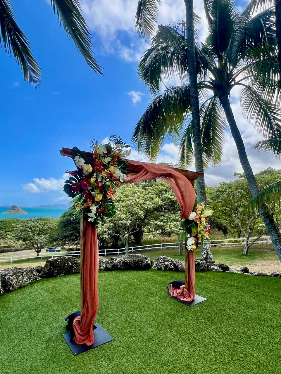 Experience the stunning array of high-end floral designs offered by Hawaii Arch Rental, Hawaii's premier floral rental company. Together we will create an magical atmosphere filled with elegance and artistry as our exquisite arrangements enchant your special day as a celebration to be cherished forever. Honor your love and the future of this beautiful island by choosing our eco-friendly floral rentals!